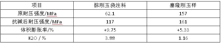 從抗堿試驗來看,剛玉莫來石樣完全潰散,無一完整的。賽隆剛玉樣與棕剛玉澆注料試樣完整無裂紋,其抗堿性試驗結果見表4。棕剛玉澆注料有較好的抗堿性能,但與賽隆剛玉樣相比,抗渣試驗后體積膨脹較大,吸收的K2O也較多。