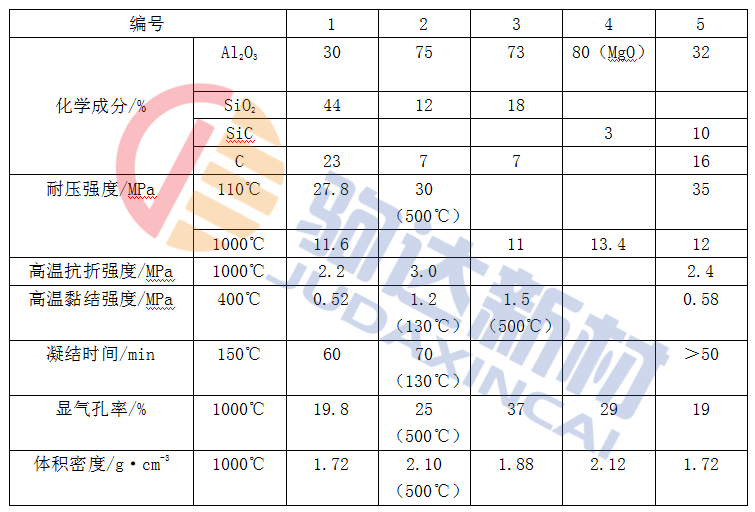 表1-2為大中型高爐耐火壓入料的性能。編號4為活底煉鋼轉(zhuǎn)爐用耐火接縫料,也可用于其爐帽周圍襯體的噴補。其余編號的耐火壓入料,一般為高鋁質(zhì)或莫來石質(zhì)的,用樹脂作結(jié)合劑,在高爐上使用,已初見成效。