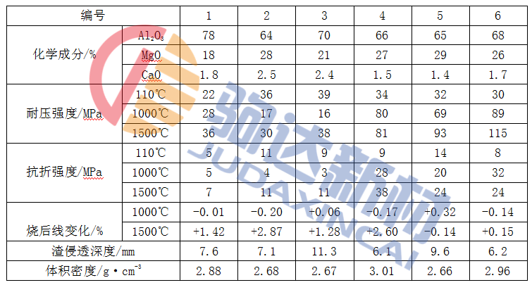 從表1-2中看出,耐火澆注料的基質料較純,較難燒結,強度較低。用混合料作基質時,則強度高些;從抗渣性上看,前者抗渣性好、后者差些。如編號3摻加了棕剛玉粉,雜質多,抗渣性差;編號2、編號4和編號6用鋁鎂尖晶石作基質,抗渣性較好,而且無變質層,抗剝落性也較好。