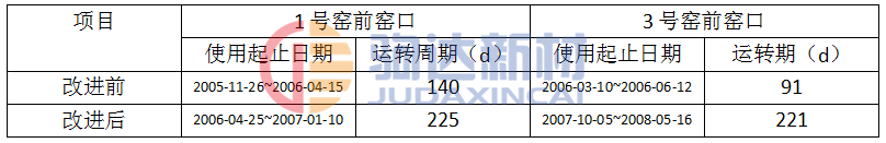 改進(jìn)前后對比如表1所示。經(jīng)過全方位優(yōu)化改進(jìn)后,窯口澆注料使用壽命實(shí)現(xiàn)了質(zhì)的飛躍,更換周期不但滿足了窯磚檢修的需要,甚至明顯超過了窯磚壽命,避免了檢修時廢舊澆注料難拆除的被動局面,自檢修以來,未再發(fā)生過因窯口澆注料而停窯檢修的情況。