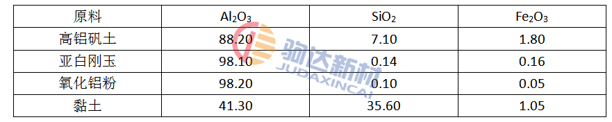 主要原料為高鋁礬土、亞白剛玉、氧化鋁粉、結合黏土,其成分和物料粒度見表1,2。