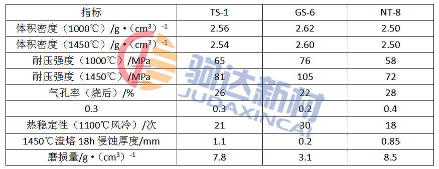 對于所使用的三種外加劑,由于GS-6的加入使物料具有較好的分散性和流動性,同時可使制品中產生的莫來石基質量增加,有利于制品高溫性能的增強。而TS-1的加入,因在燒結開始時表面出現液相,使得氣孔封閉,組織了內部的進一步燒結,對制品的高溫性能產生不利影響,NT-8的加入,可使加入物與顆粒連接緊密,但高溫下膨脹使得材料強度下降。