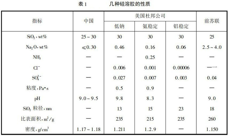 硅溶膠即硅酸溶膠,呈乳白色膠液,帶負電性,其通實為xSiO2·H2O,由下列成分構(gòu)成:偏硅酸(H2SiO3),二偏硅酸(H2SiO2)2,和正硅酸(H4SiO4)。膠體粒子約10~80mm。硅溶膠的制備方法很多,如水解四乙氧基甲硅烷:電解、滲析、電滲析硅酸鈉溶液:水解四氯化硅或硅酸酯:用氣態(tài)氟處理硅酸鈉:分散硅凝膠懸浮液等。最廣泛使用的方法有酸法、離子交換法和電滲析法。各種硅溶膠的性質(zhì)如表1