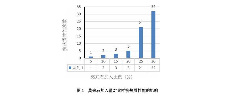 以白剛玉、燒結(jié)莫來石為主要原料,以AL2O3微粉、Cr2O3微粉、少量添加劑為基質(zhì),以進口木質(zhì)素溶液為結(jié)合劑,莫來石加入量(質(zhì)量分數(shù)分別為0、5%、10%、15%、20%、25%、30%)對鉻剛玉磚抗熱震性能和其他物理性能的影響。結(jié)果表明:1600℃燒后試樣,隨著莫來石加入量的增加,體積密度和耐壓強度均會呈下降趨勢,抗熱震性能則呈逐漸增加趨勢,但增加的量并不明顯,只有加入量在25%以上時抗熱震性能則會降低。綜合對比,莫來石加入量在25%~30%著個區(qū)間比較合適,既能滿足熱震需求,又能保證其他物理指標處于均衡狀態(tài)。不同莫來石加入量對試樣抗熱震性能的影響如圖1所示