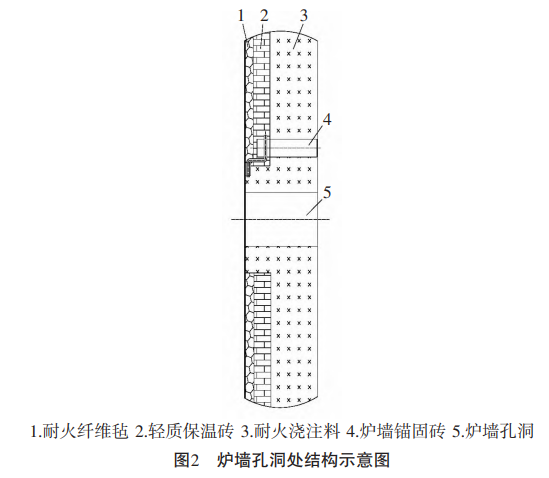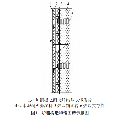 爐襯由耐火纖維氈、硅鈣板(或輕質(zhì)保溫磚)及低水泥耐火澆注料組成。耐火纖維氈緊靠爐殼安放或放置在輕質(zhì)磚與低水泥耐火澆注料襯之間。鋼筋拉桿用的固定件厚壁鋼管必須與爐殼鋼板焊接牢固。錨固磚長度應(yīng)與爐墻總體厚度相配套,以滿足施工要求。錨固磚通過鋼筋拉桿與爐殼連接,且為活動式,錨固磚冷端面與爐殼間距應(yīng)≥40 mm,這樣可隨著爐墻的漲落而上下移動,也能隨著爐墻的漲縮而 左右移動,保證了爐墻的穩(wěn)定和使用壽命。