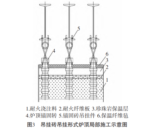 爐頂襯體材料與爐墻材料基本相同,也是由輕、 重質(zhì)耐火材料配合使用,厚度分別為50~150 mm和 200~300 mm。圖3為吊掛磚吊掛形式的爐頂局部施工 示意圖。吊掛磚一般為直線形布置,其中心距為300~ 350 mm。高溫部位吊掛磚中心距采用下限,反之則采 用上限,這樣可以減少爐頂錨固磚頂面及周圍散熱損失。遇到孔洞時,允許布置成梅花形狀。爐頂四周 的吊掛中心線,應(yīng)與爐墻工作面保持一定距離。