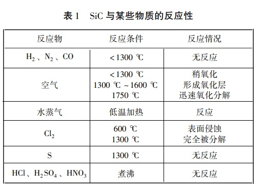 碳化硅( SiC) 具有極好的耐磨及抗高溫性能, 可以用作磨具的磨料和耐火材料。 碳化硅作為耐火材料常用作冶煉行業的高爐襯里和航天的火箭噴口。 碳化硅耐火材料使用溫度一般為 1400 ℃~ 1600 ℃ , 其具有優異的耐酸性和耐磨性能, 高溫下強度高、熱膨脹系數小、導熱性強、抗熱沖擊性強、熱震穩定性好。SiC與某些物質的反應性見表 1